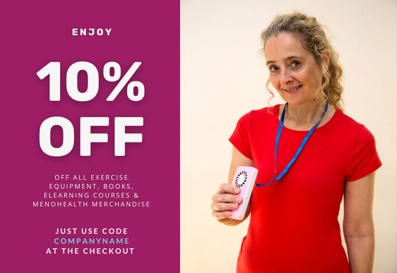 The coupon is valid on all exercise equipment (including bender balls and resistance bands), books, eLearning courses and MenoHealth merchandise. Simply enter the coupon COMPANYNAME at the checkout.